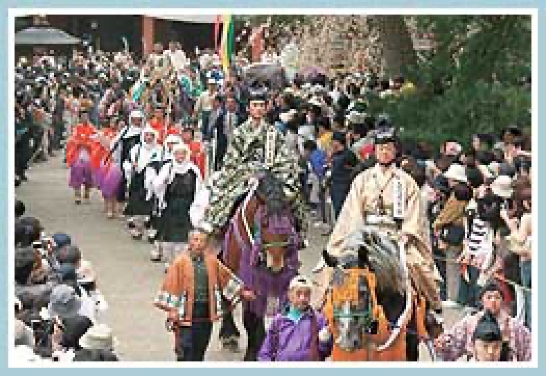 「源義経公東下り絵巻」は、藤原氏三代の栄華を今に再現した全国的にも知られた祭事です。なかでも、3日に開催される「源義経公東下り行列」は、義経が兄頼朝より逃れて平泉に着いたとき、藤原秀衡が喜んで自ら出迎え、民衆も歓喜したという情景を再現しています。義経公役には毎年、人気の芸能人が扮し、沿道を埋める観光客から大きな歓声が飛び交います。