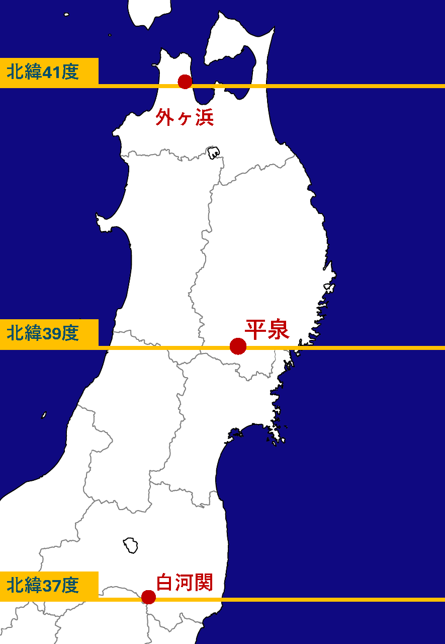 事実、清衡の統治範囲は、南は福島県白河関、北は青森県外が濱に及ぶものでしたが、白河関が北緯37度、外が濱が41度であるのに対し、中尊寺は北緯39度と、文字通り東北地方の中心に位置していました。